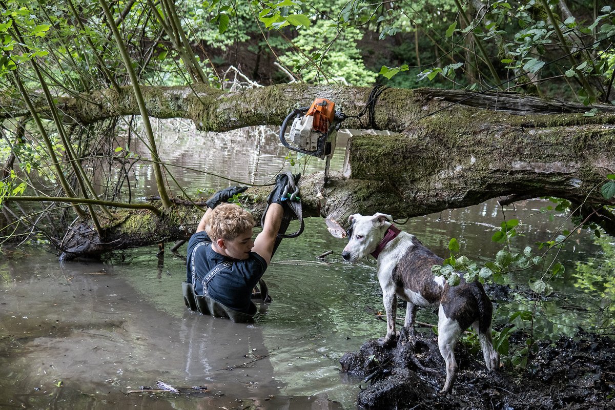 tied off so it didnt drop in the pond when we winched the tree and released the saw
