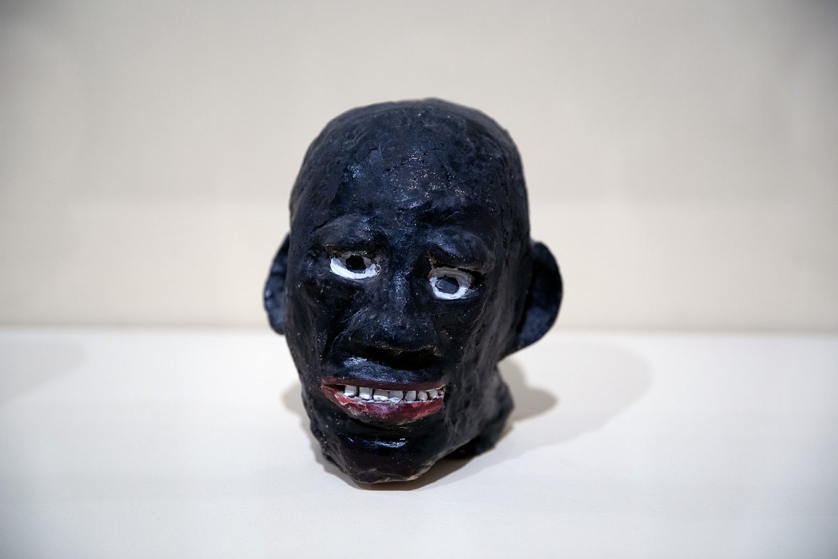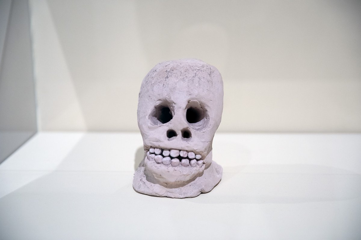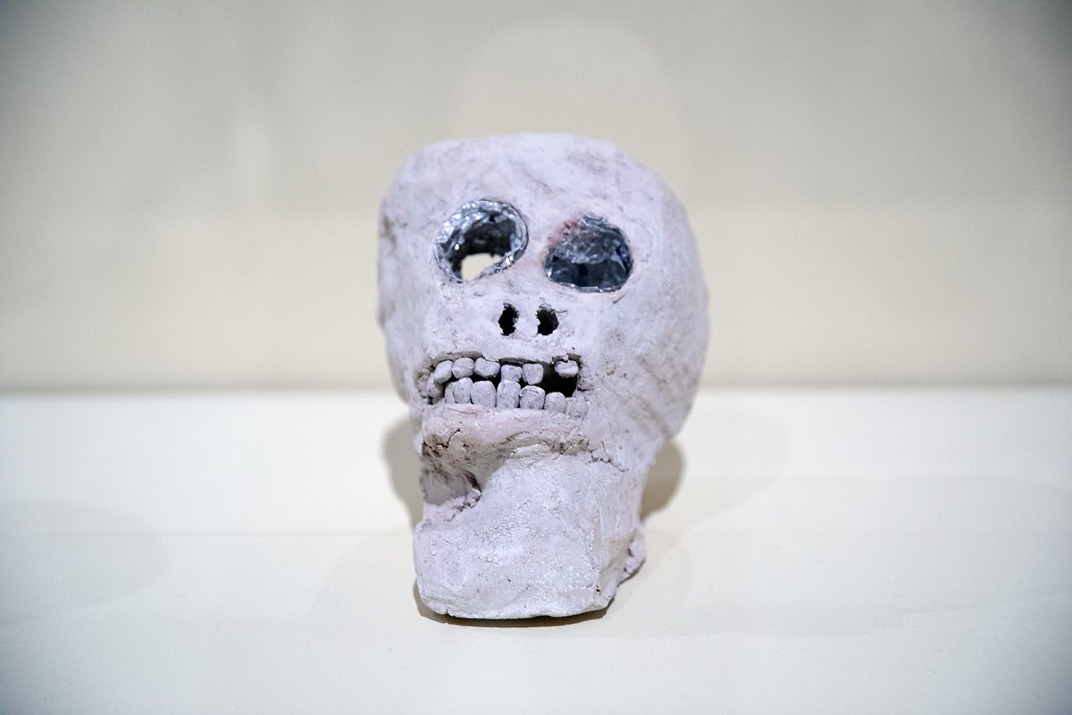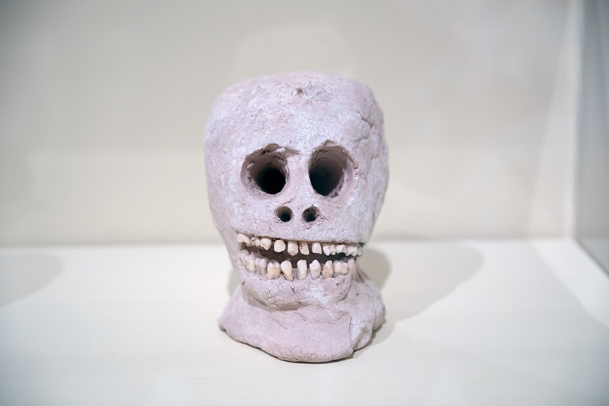 sculpted heads from unfired clay, many feature human teeth